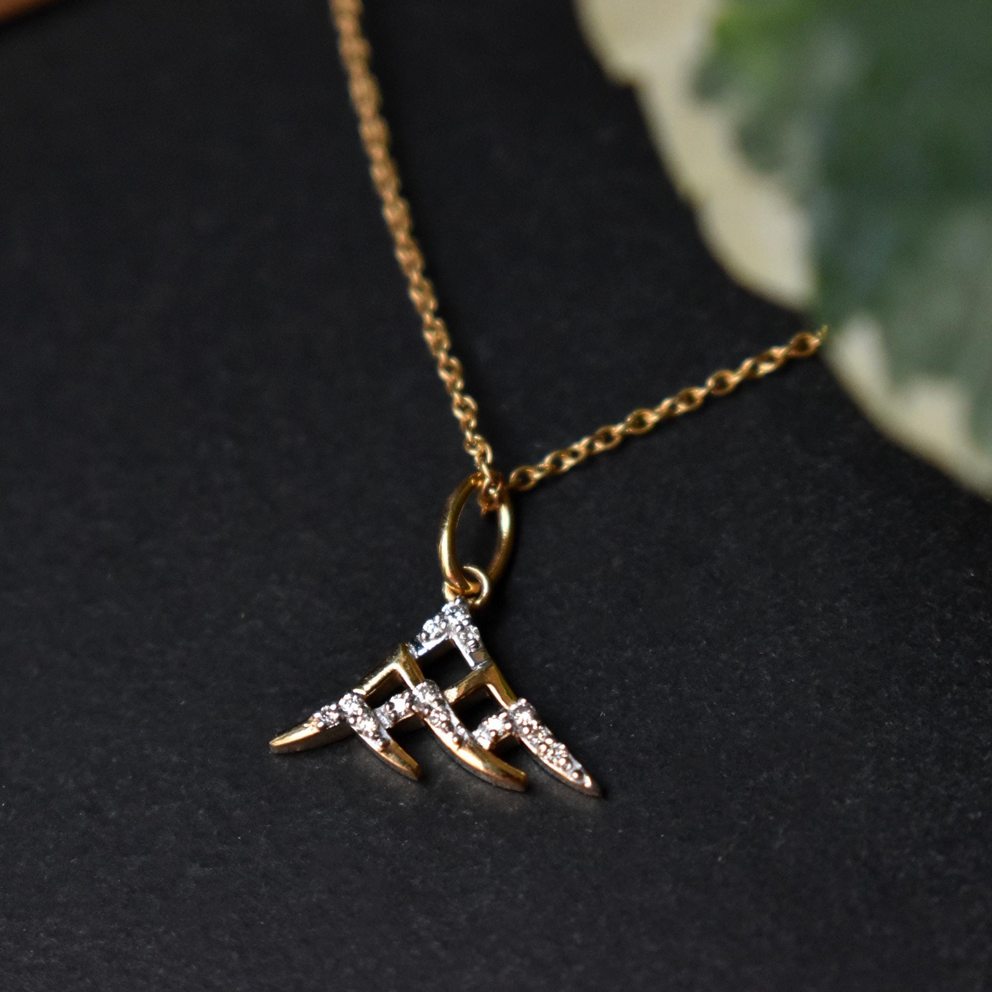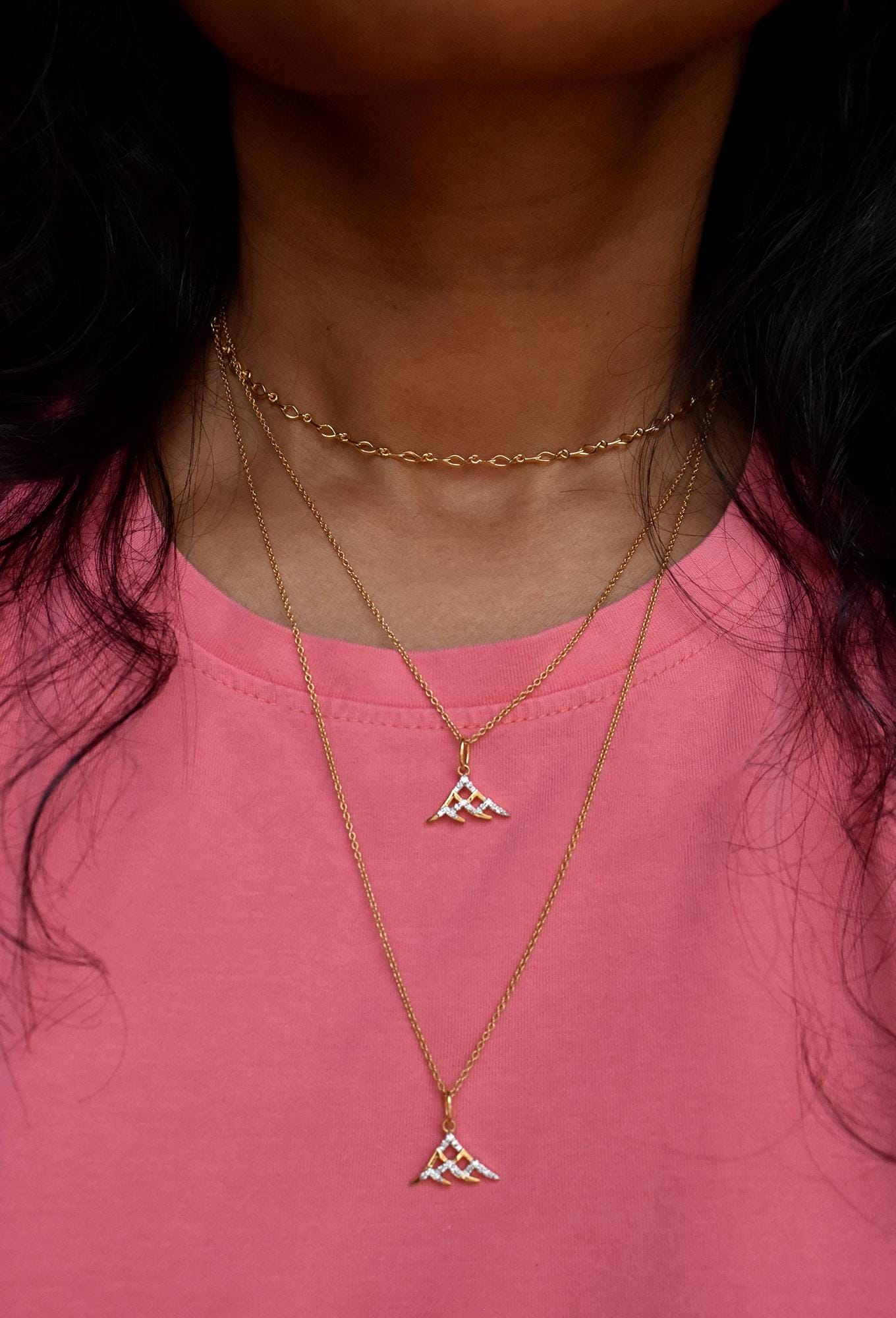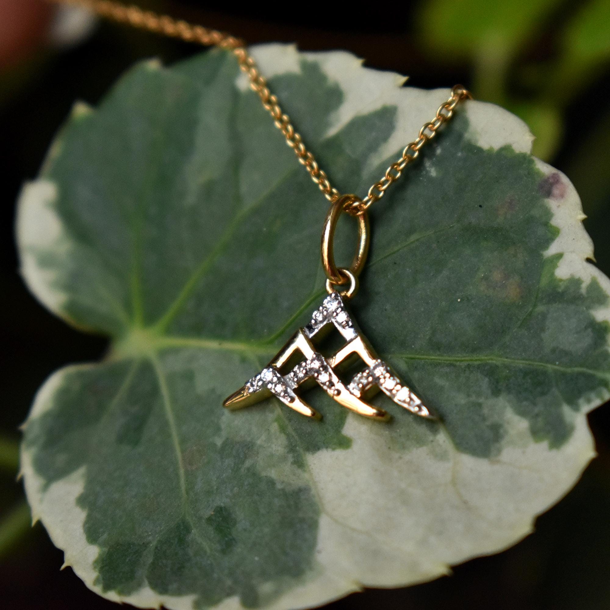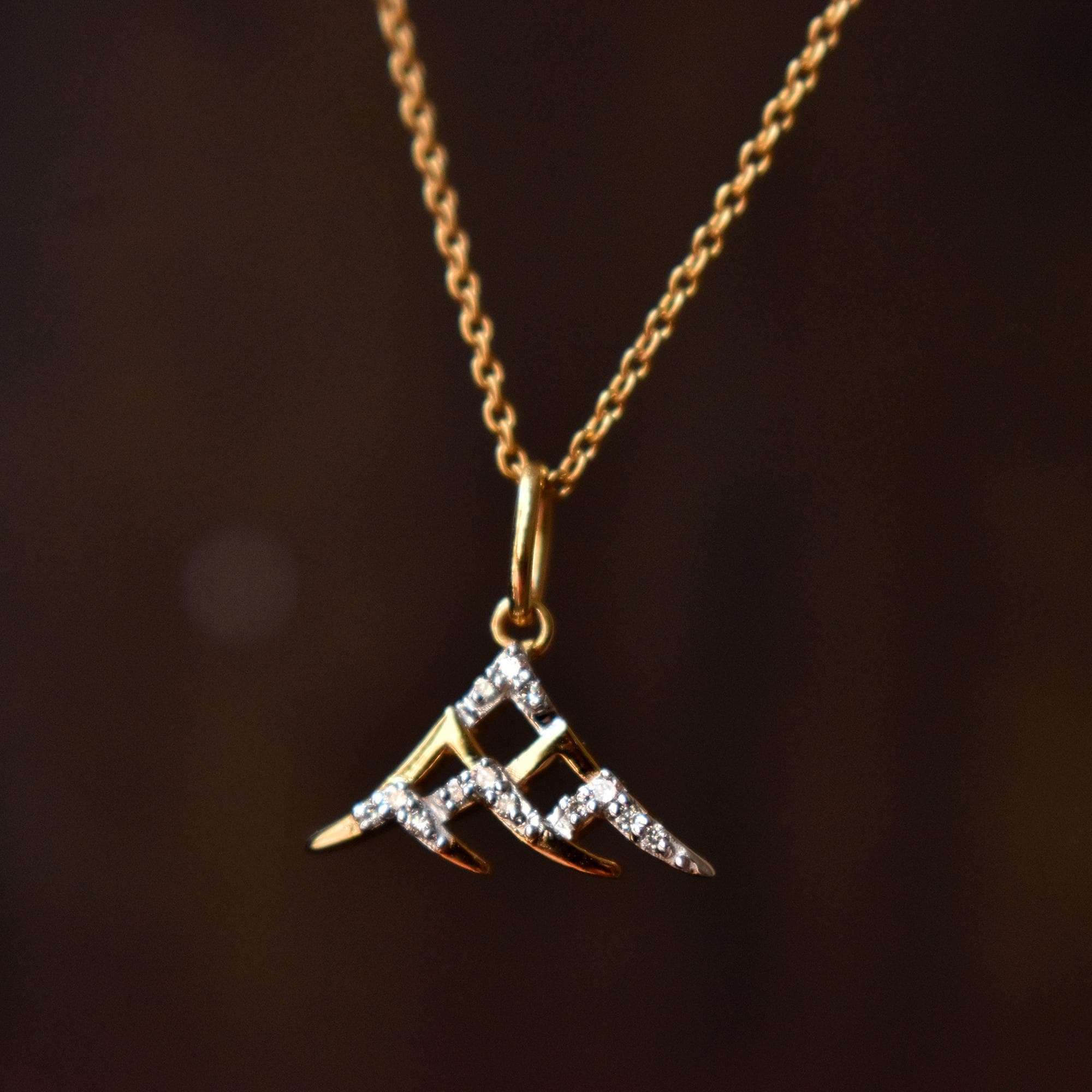 Mountain peaks charm pendant in solid 14k/18k gold with diamonds, this piece is THE souvenir of love. Gold for the warm glow of mother earth and natural diamond studded peaks to depict snow. A great gift for someone who loves trekking and camping and snow.