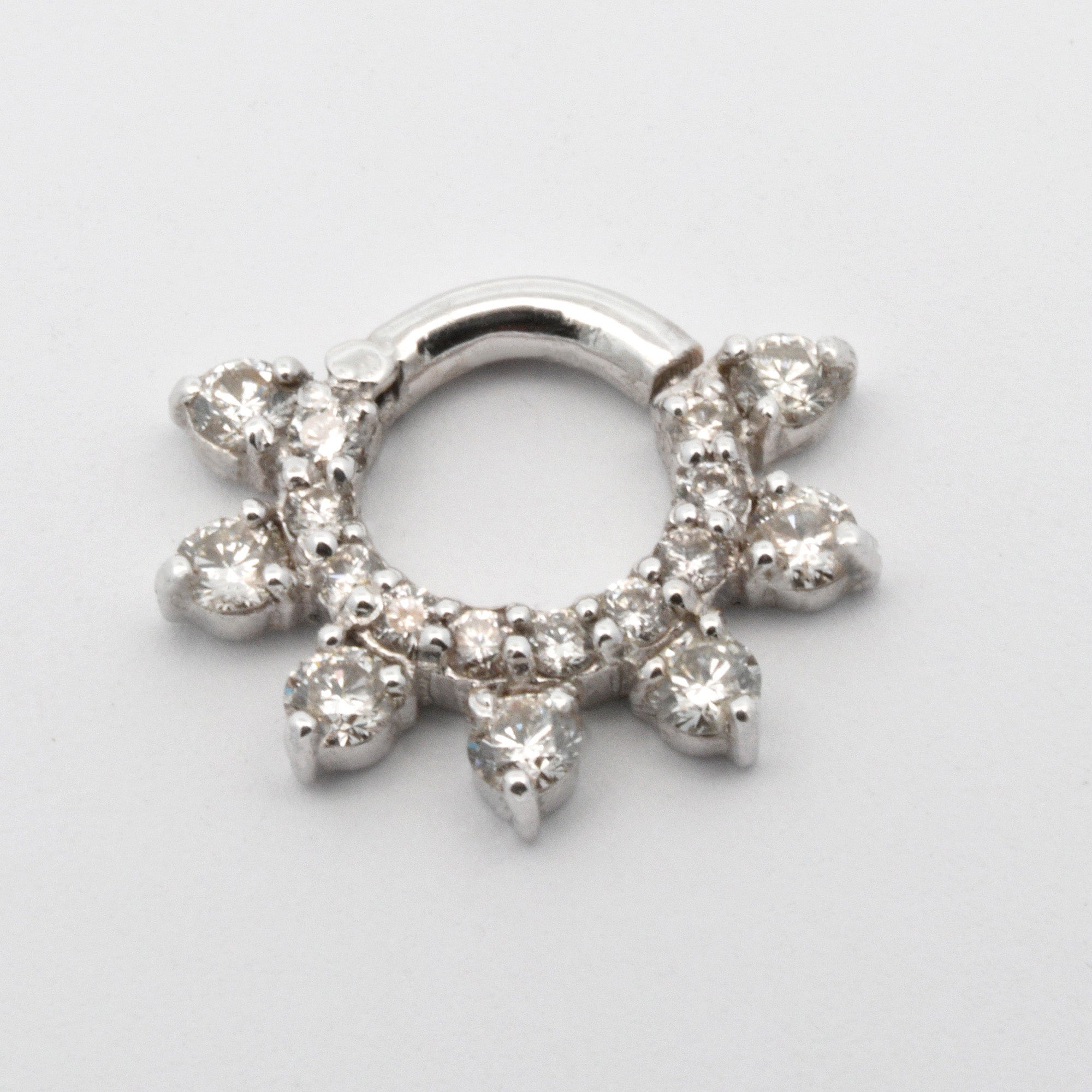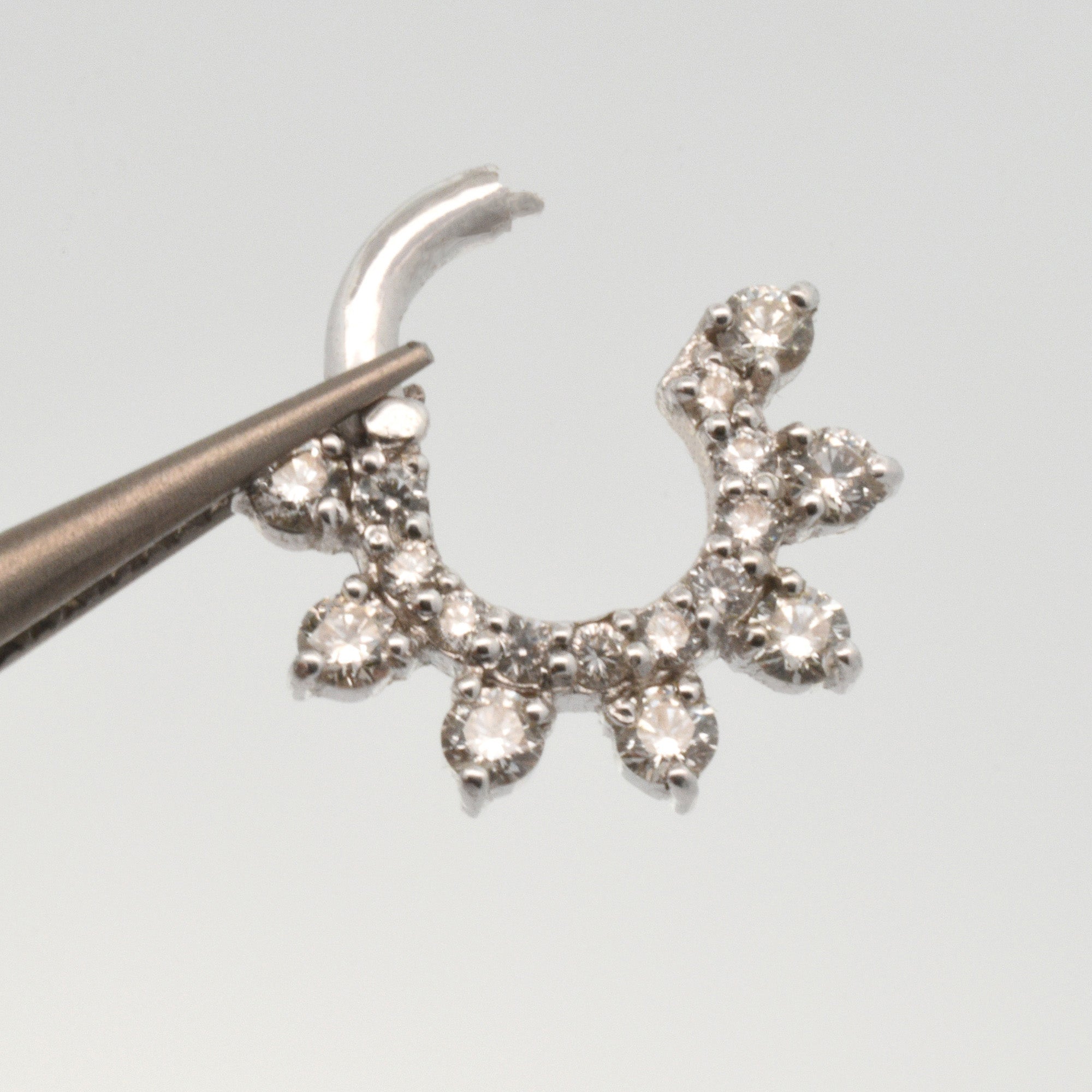 Natural diamonds, spaced out around a diamond studded ring, this clicker is a subtle but no so subtle accessory. Best for septum, daith and nose piercings. A perfect birthstone gift for the-crazy-about-diamonds April born!