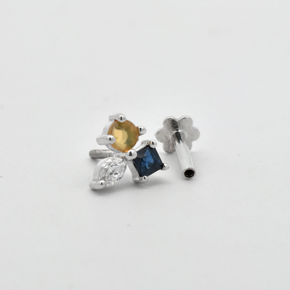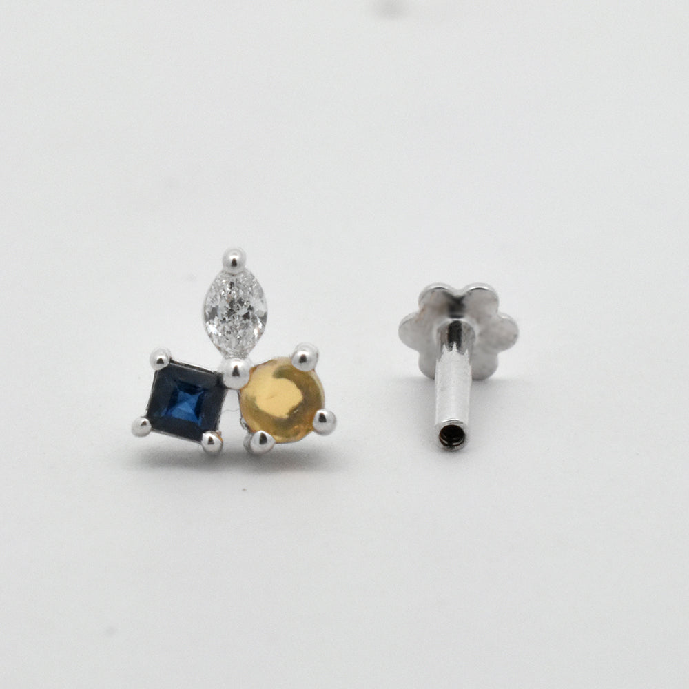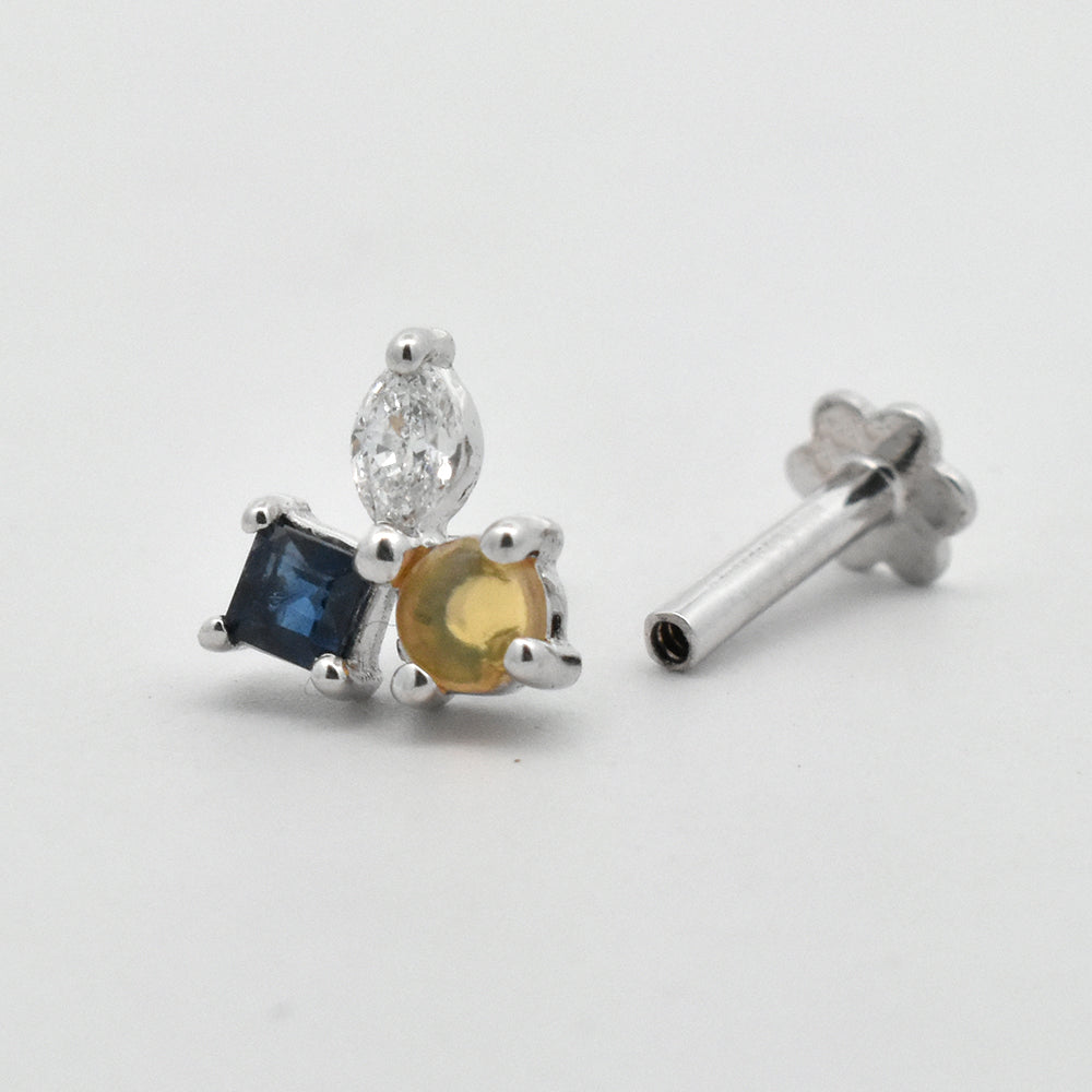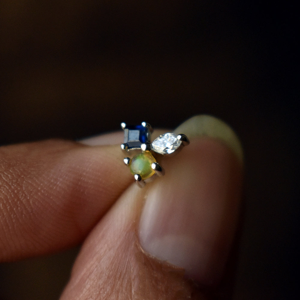 Natural Diamond, Blue Sapphire and Opal, is a harmonious trinity, this striking stud is crafted in solid 14k gold. All three gemstones are different in shape - Round, Princess and Marquise. A perfect mother-daughter gift, birthstone birthday gift or siblings gift! Suitable for any and all piercings - lobe, cartilage, conch, helix or tragus piercing. It also makes for a mesmerizing nose jewelry.