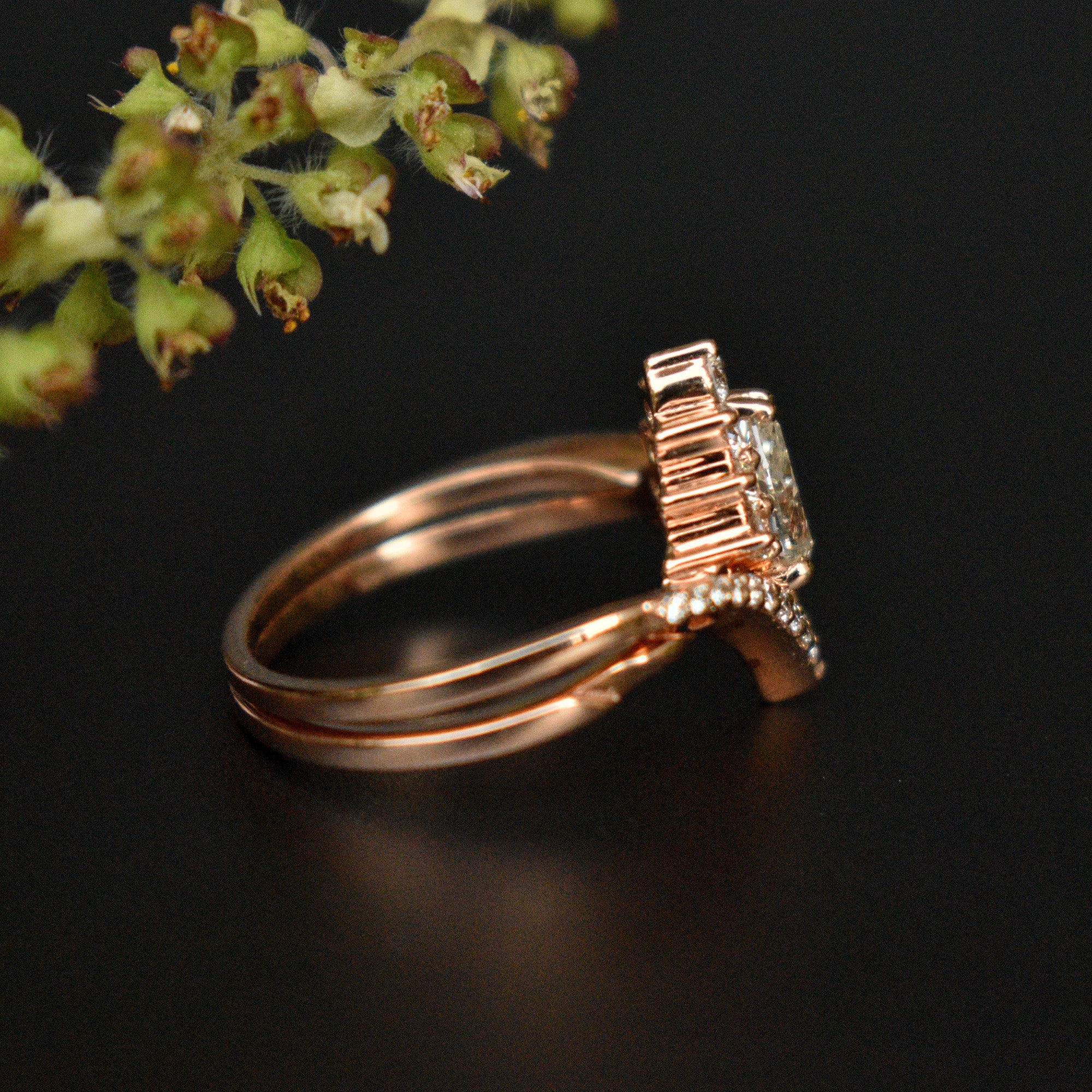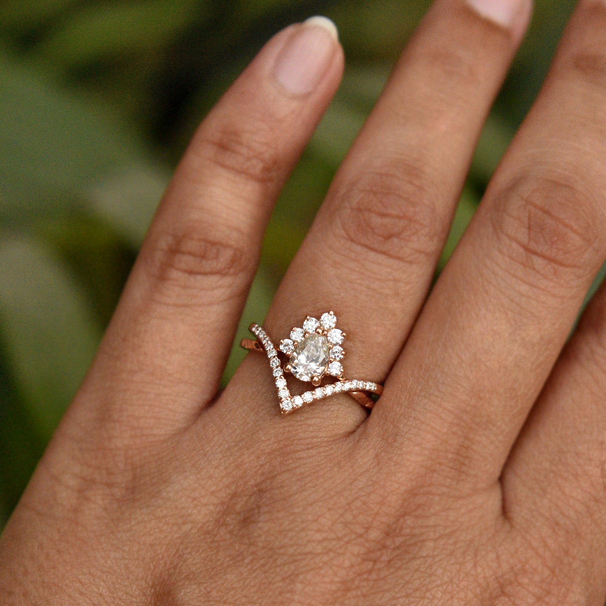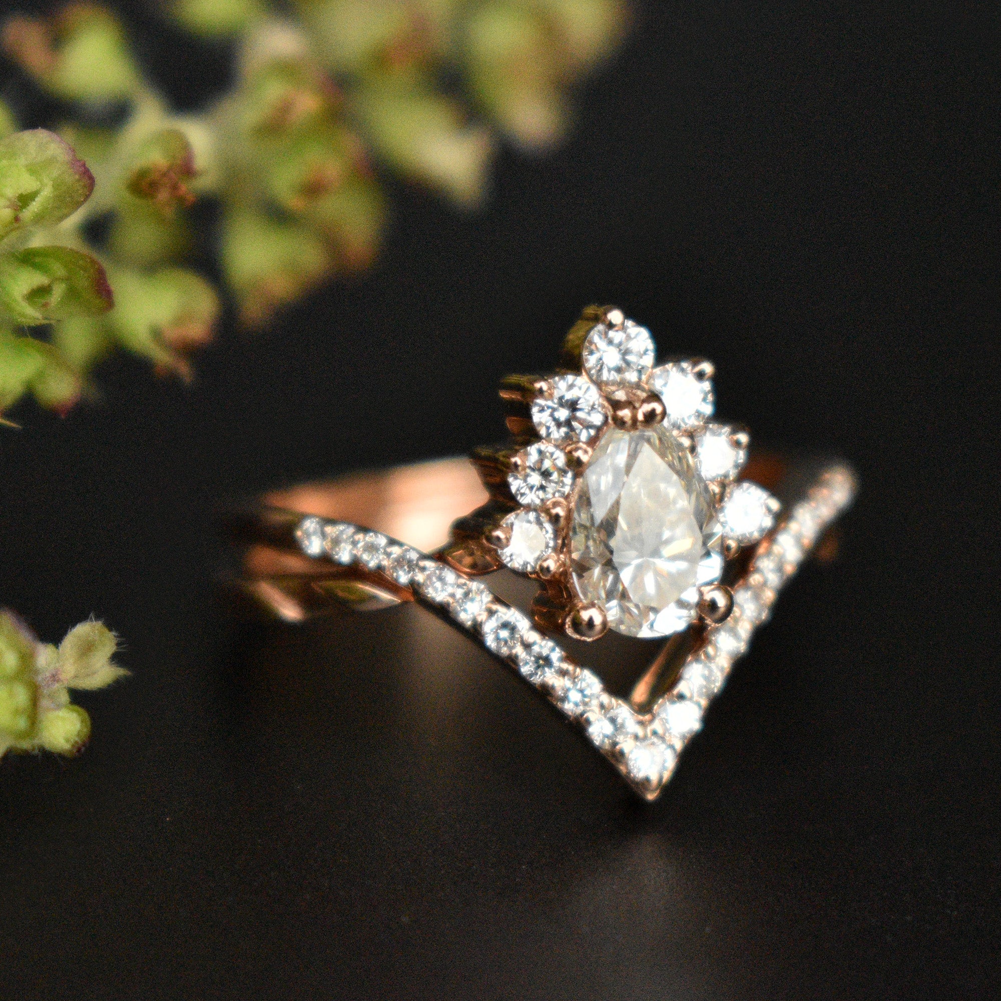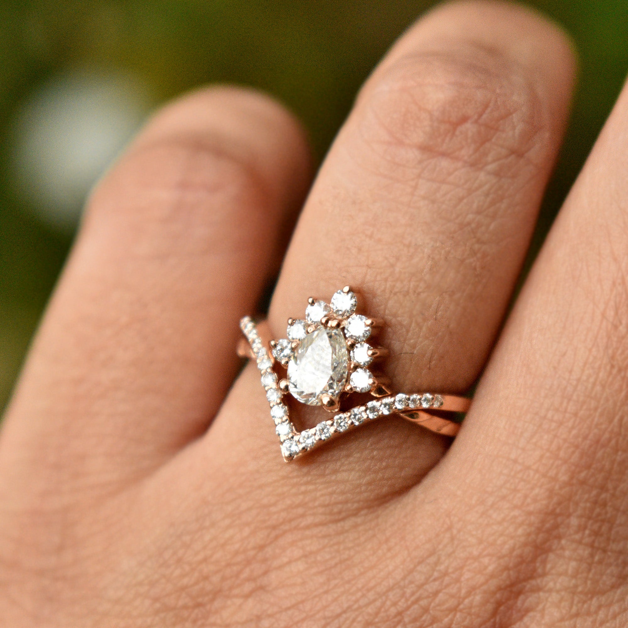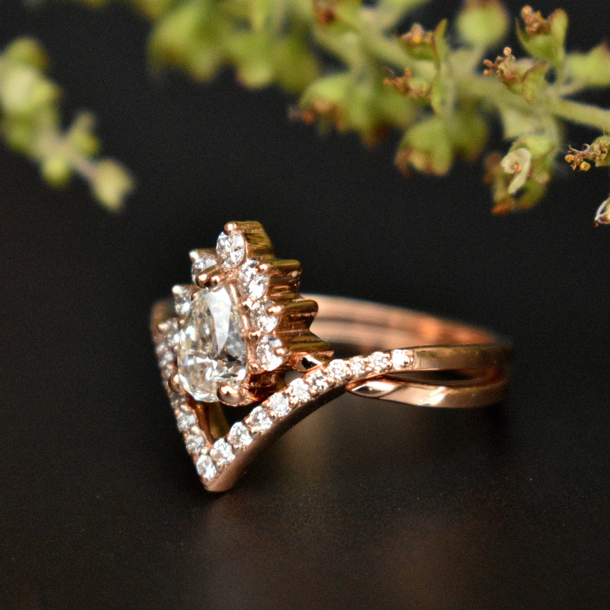 Unique crossover wedding ring set, these rings fit like pieces of a puzzle. A half carat pear cut diamond with a quarter halo and a classic chevron V ring, these rings make a set you cannot NOT own!