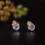 Mesmerizing 5mm round cabochon cut natural rainbow moonstone, like drops of heaven, set in a solid 14k rose gold bezel setting, these studs are you wedding must-have's. They also make for a perfect gifting pair for little girls to women alike.