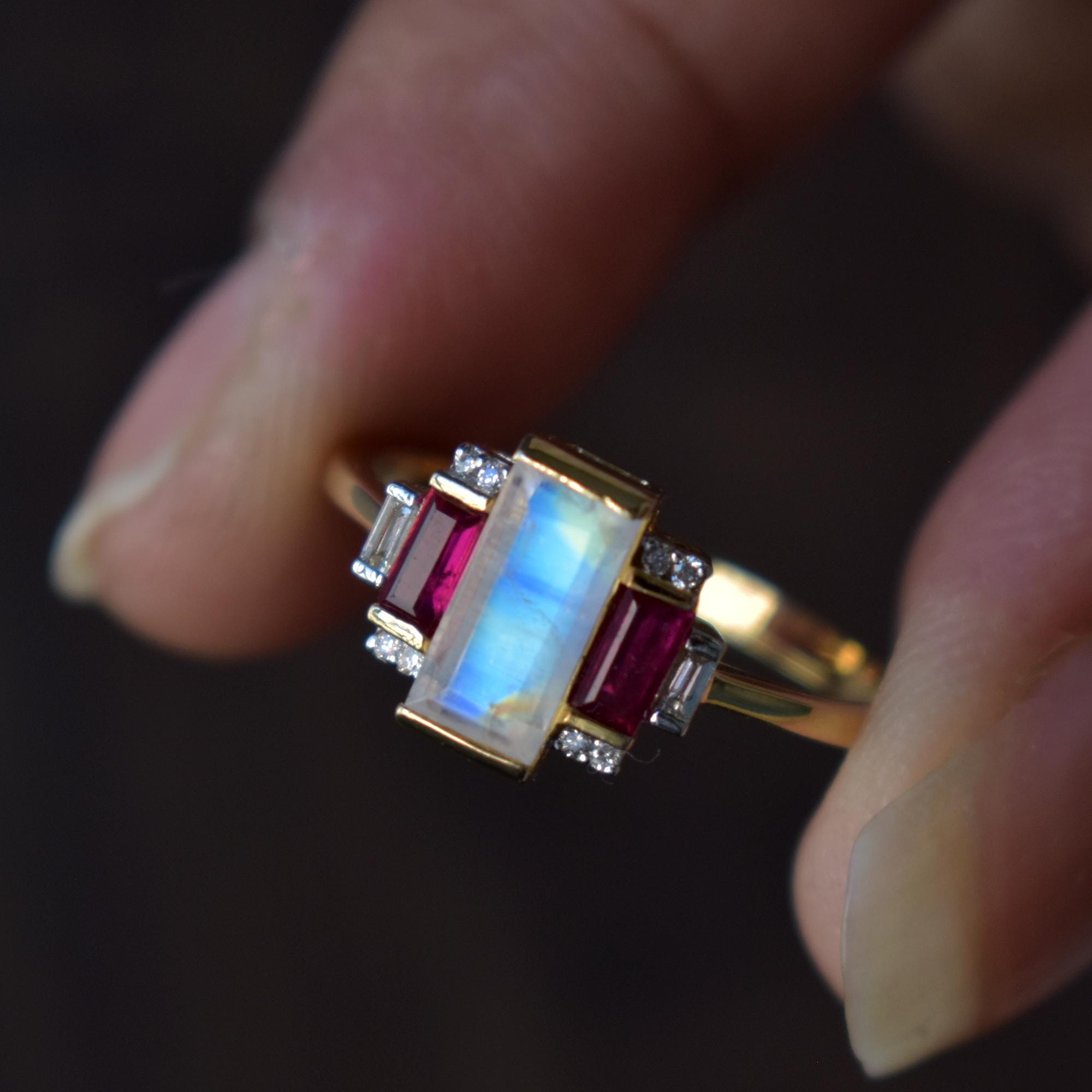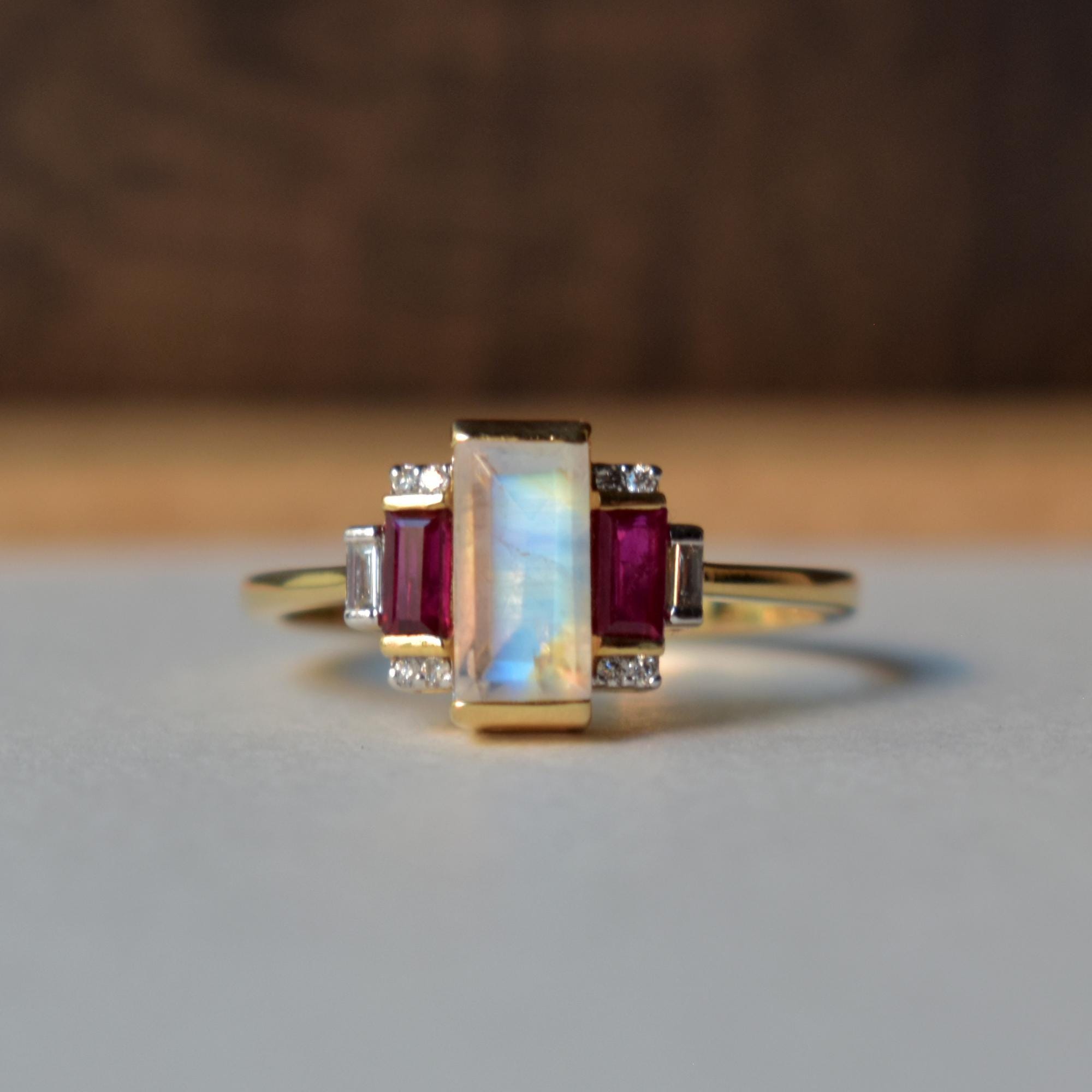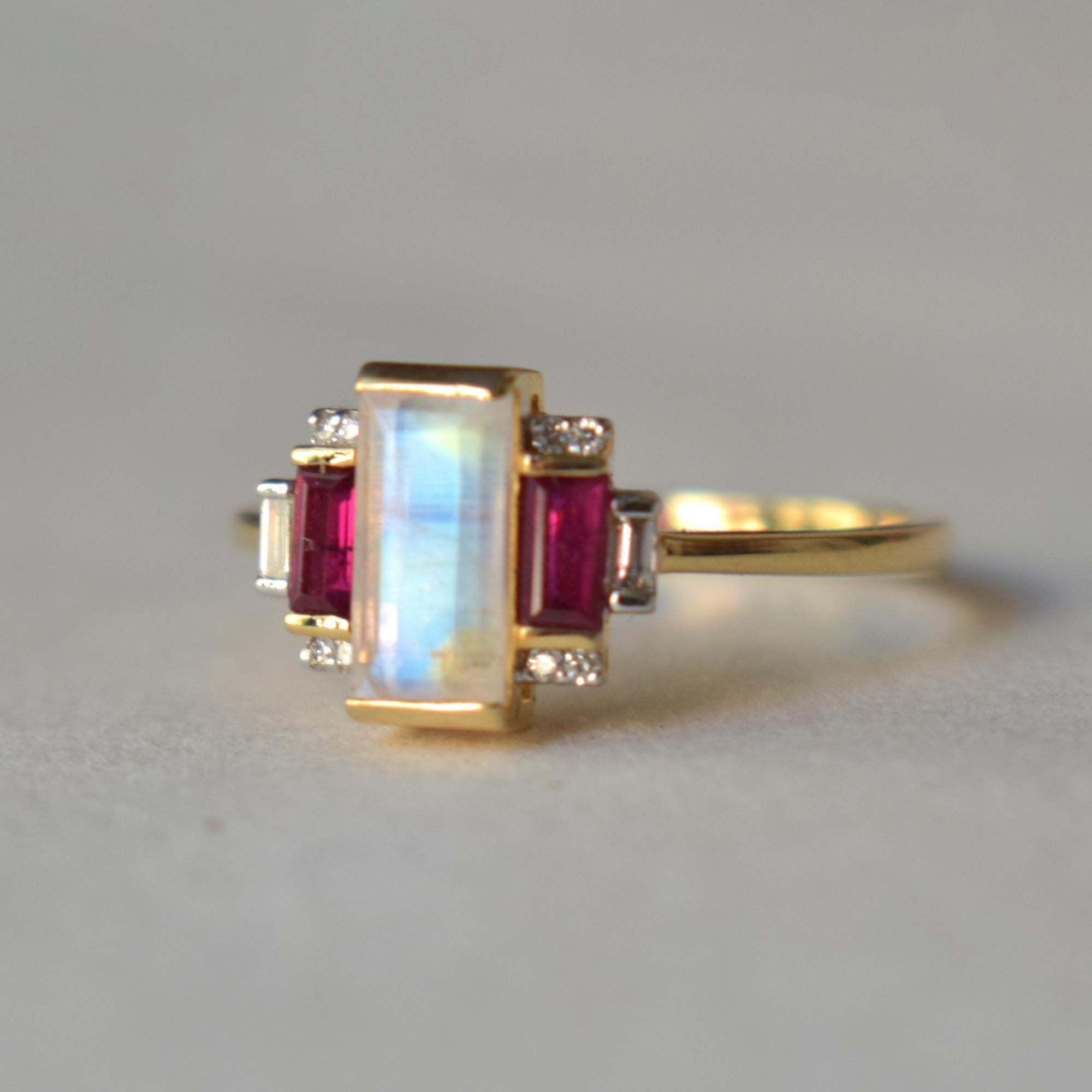 Natural Moonstone Ruby & Diamond Unique Geometric Ring