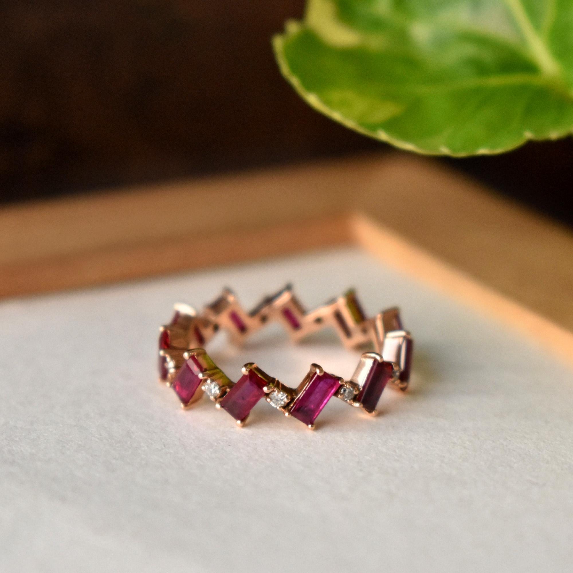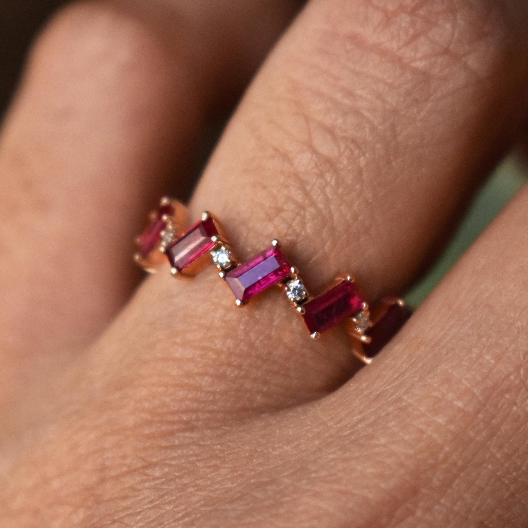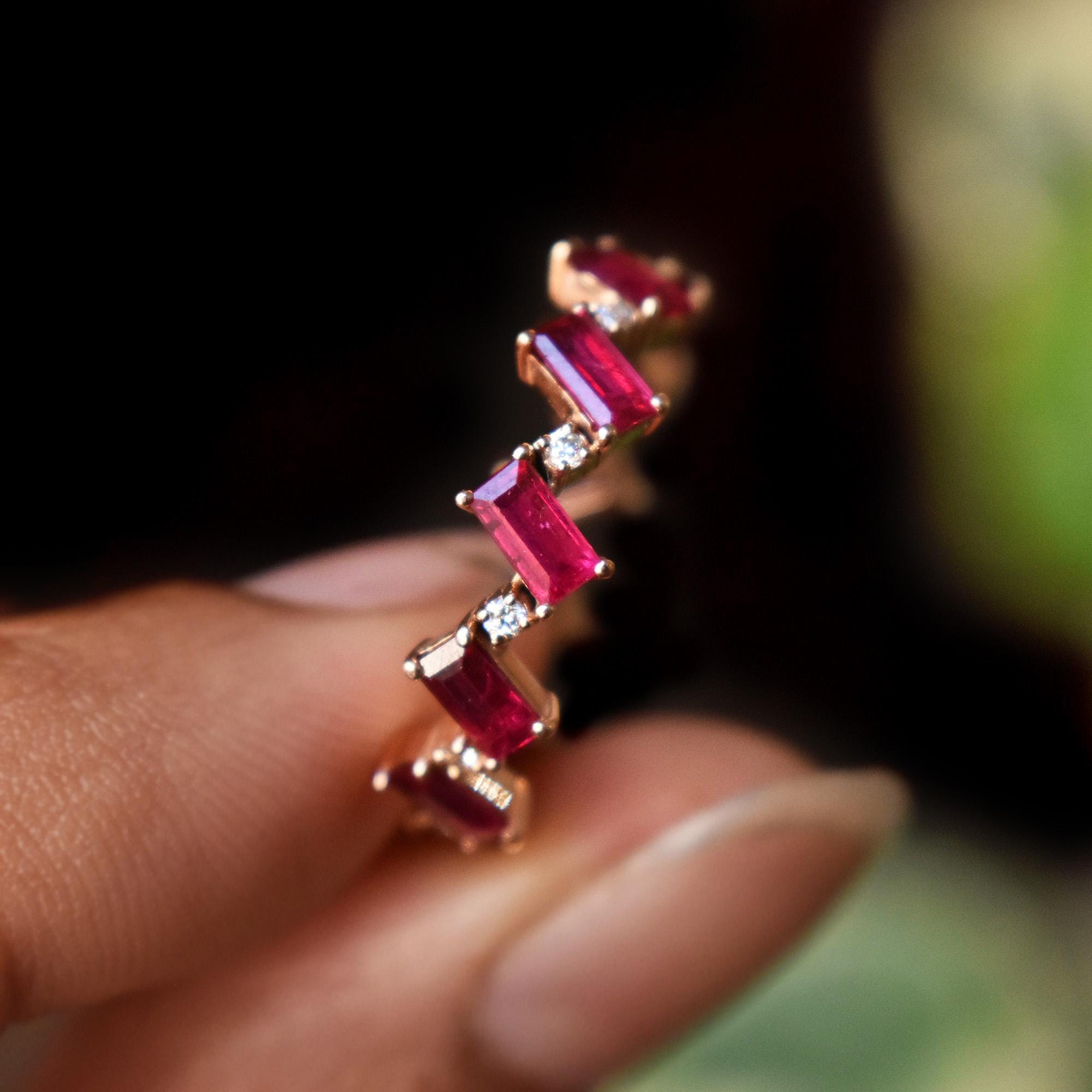 Symbolic of passion, protection and prosperity, Rubies are the birthstone of those born in July. This ring features baguette cut natural Rubies in a zig-zag chevron pattern with round natural diamonds. Crafted in solid 14k or 18k gold, it can be worn by itself or stacked. Add a pop of color to your style with this gorgeous band.