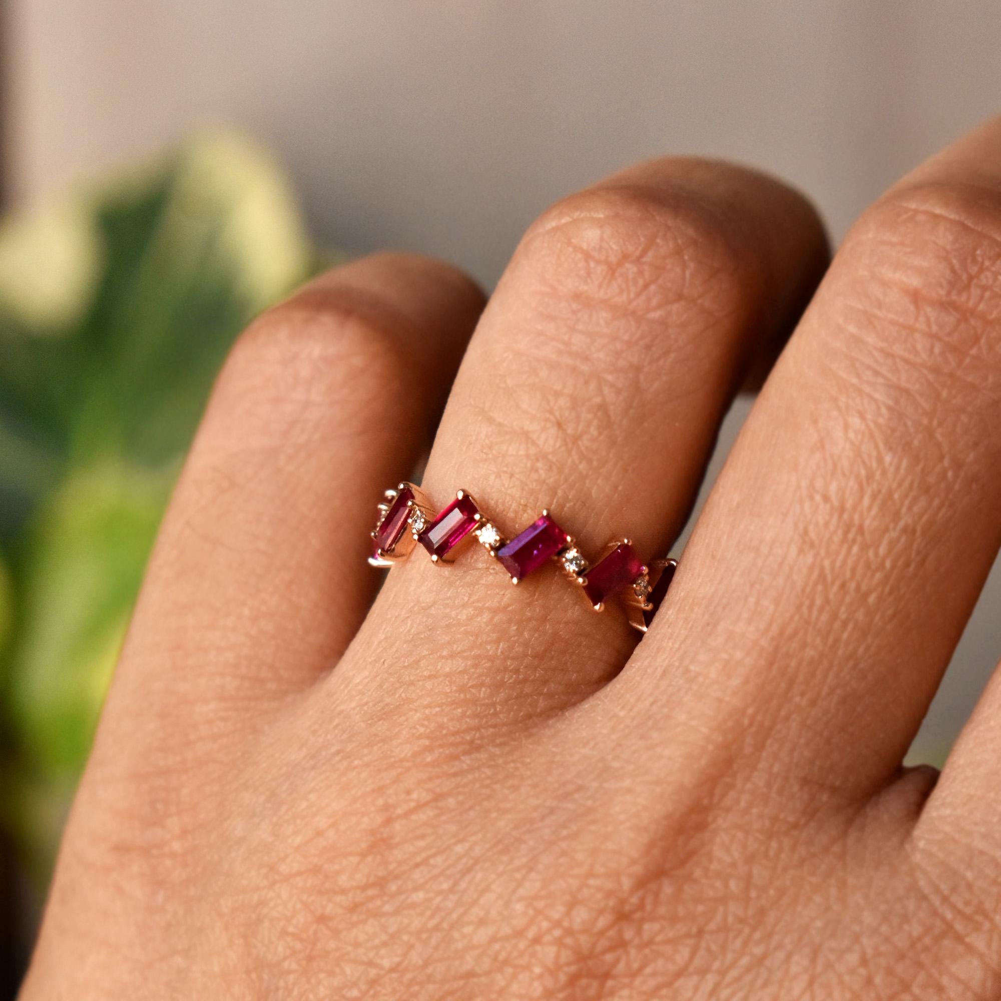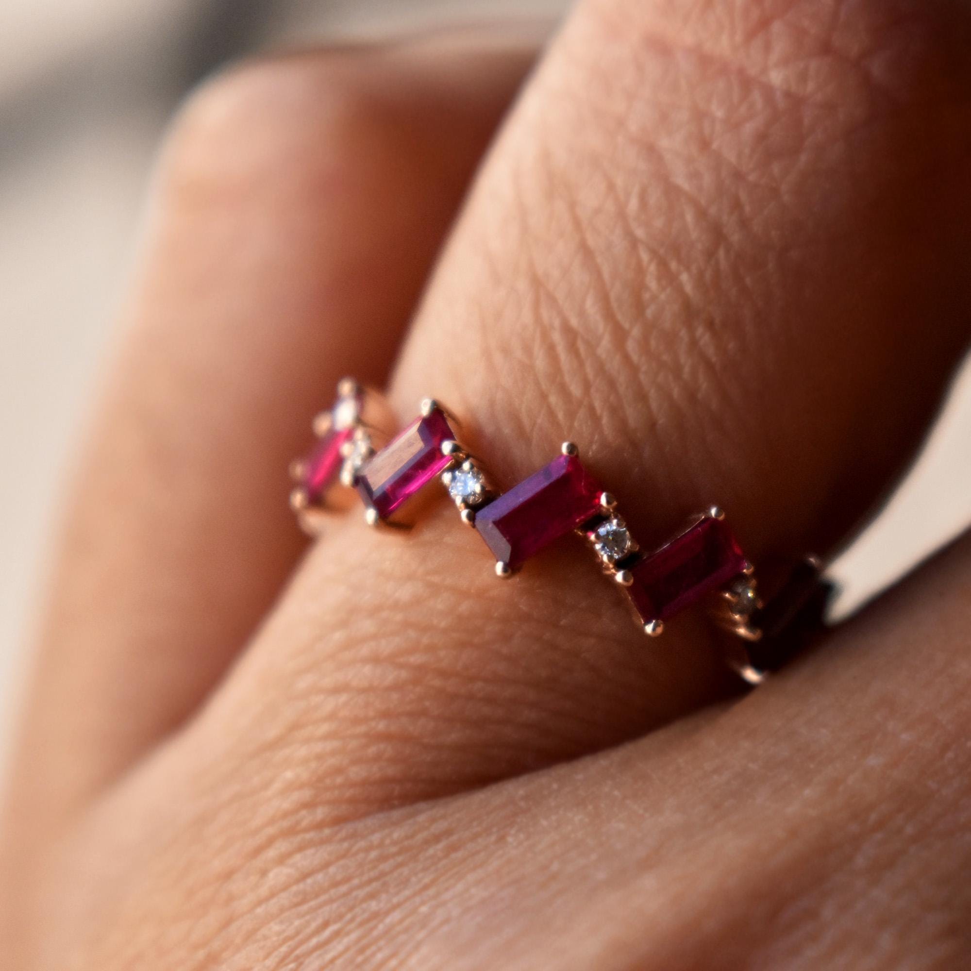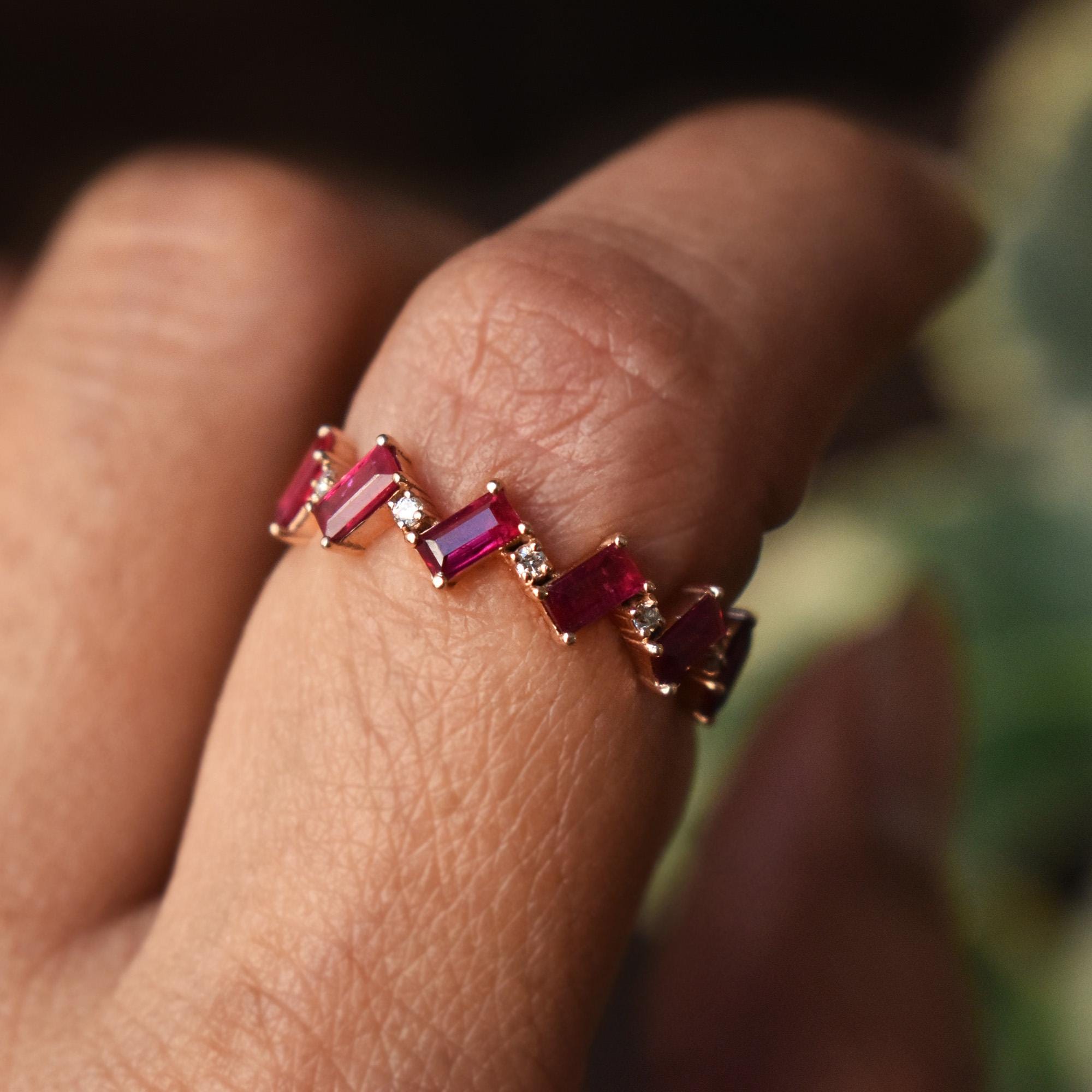 Symbolic of passion, protection and prosperity, Rubies are the birthstone of those born in July. This ring features baguette cut natural Rubies in a zig-zag chevron pattern with round natural diamonds. Crafted in solid 14k or 18k gold, it can be worn by itself or stacked. Add a pop of color to your style with this gorgeous band.