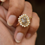 A subtle 0.57ct brown emerald cut Diamond, flanked by white princess cut and baguette cut diamonds on either side, this 5 diamond ring is crafted in 14k solid rose gold. A unique solitaire ring, for your exclusive story!