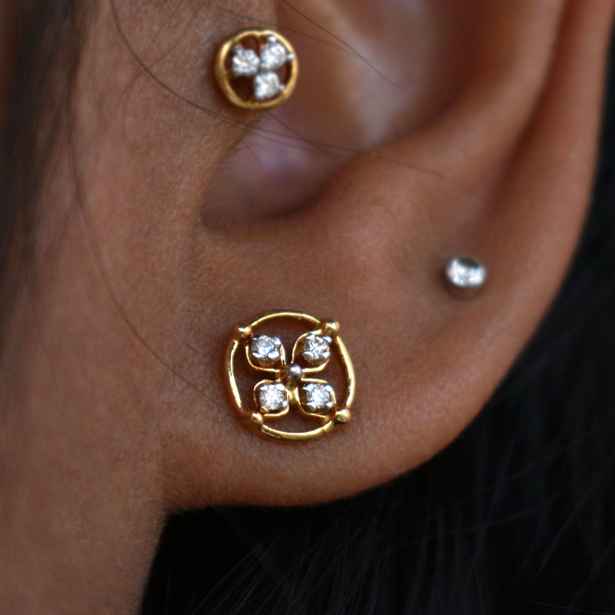 $269.00Dainty little 3 diamond flower stud, a perfectly feminine and pretty accessory for all your piercings. Can be worn in nose, tragus or lobe. • Gold: 14k Solid Gold •...