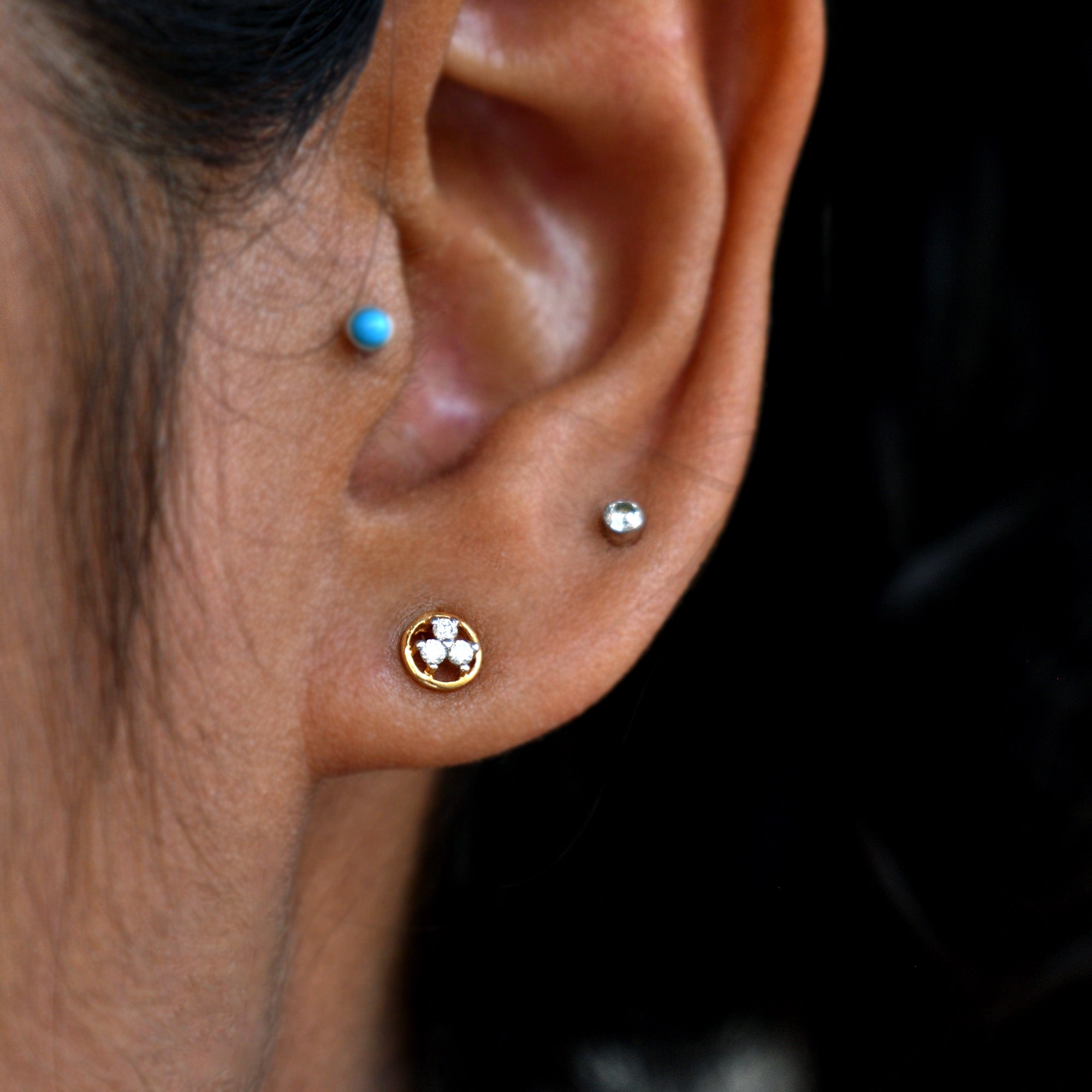 $240.00A tiny natural Diamond trinity enclosed in a solid gold circle, this cluster nose pin is a perfectly unique and pretty accessory for all your piercings. Makes for a gorgeous...