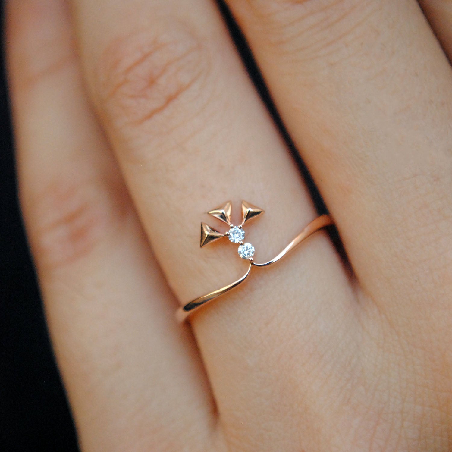 $300.00Three gold triangles, atop 2 sparkly round diamonds, this stack ring, inspired from the famous Indian tribal 'Warli' paintings, is crafted in 14k Gold and looks stunning worn alone or...