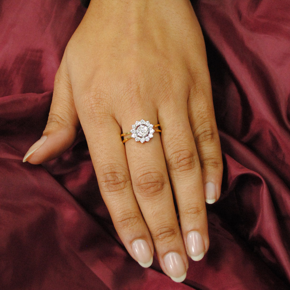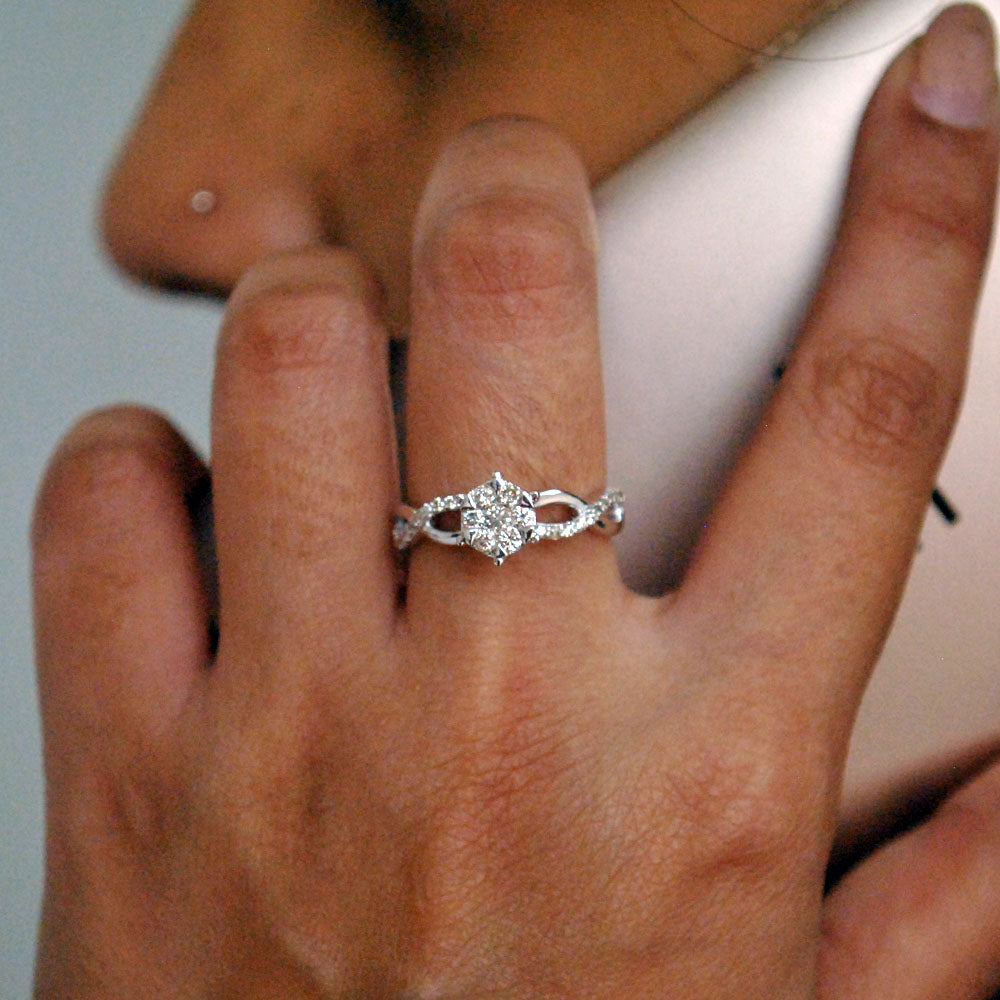 $1,219.00A lovely cluster of pressure set round diamonds, giving an illusion of a solitaire, on a gorgeous twisted diamond studded band handcrafted, this classic-with-a-twist engagement ring is crafted in solid...