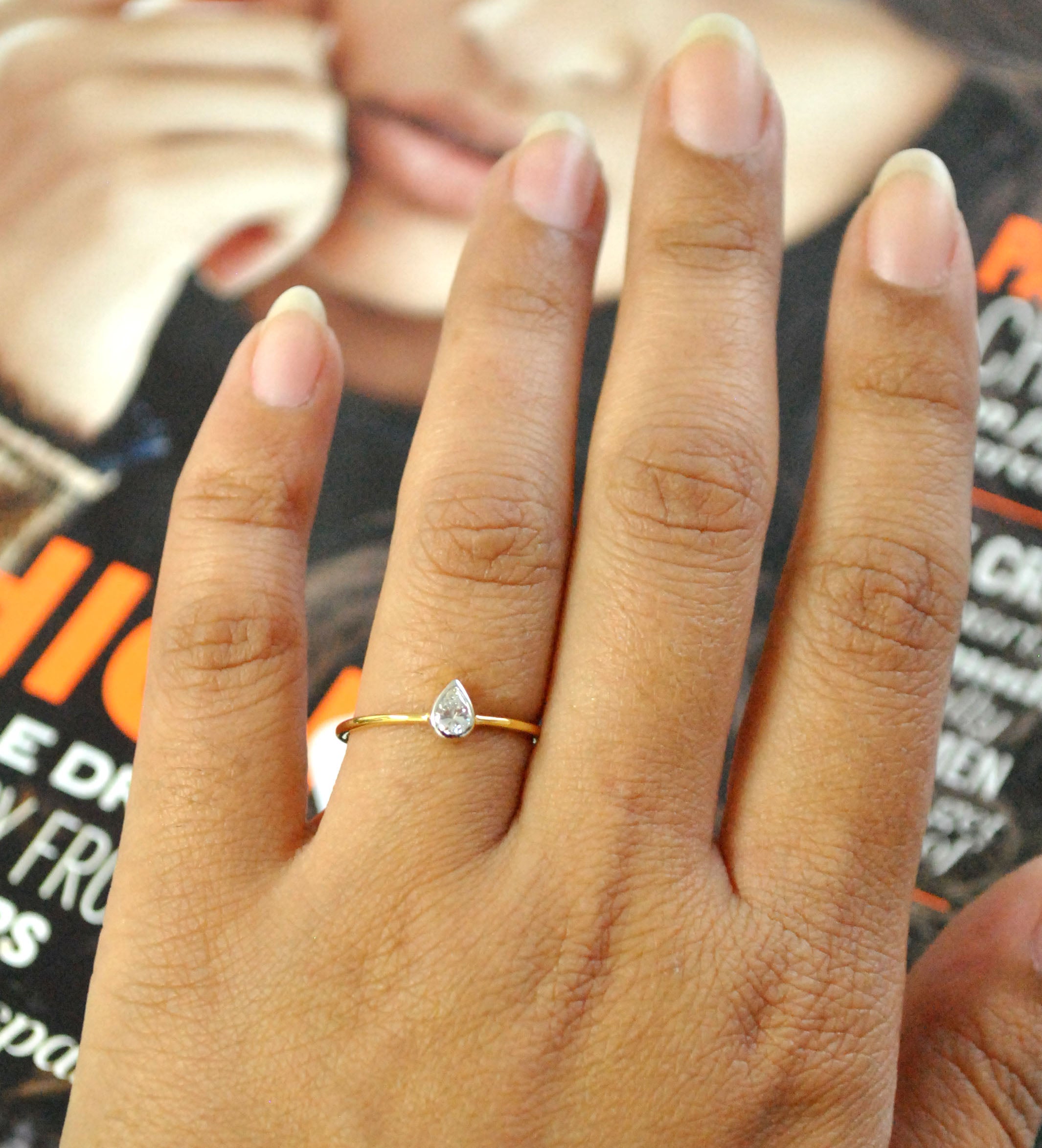 $825.00Dainty minimal diamond ring with a small pear cut natural diamond bezel set in a 14k solid gold setting. Simple and affordable, this pretty ring is comfortable and perfect to...