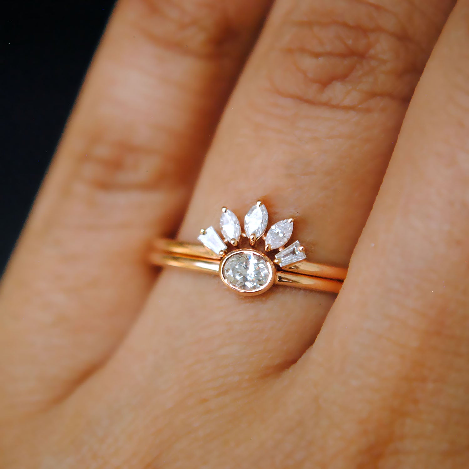 $1,350.00Dainty gold & diamond wedding ring set, with a baby oval diamond set east-west on a 1mm band in the engagement ring, crowned by a marquise and baguette diamond curved...