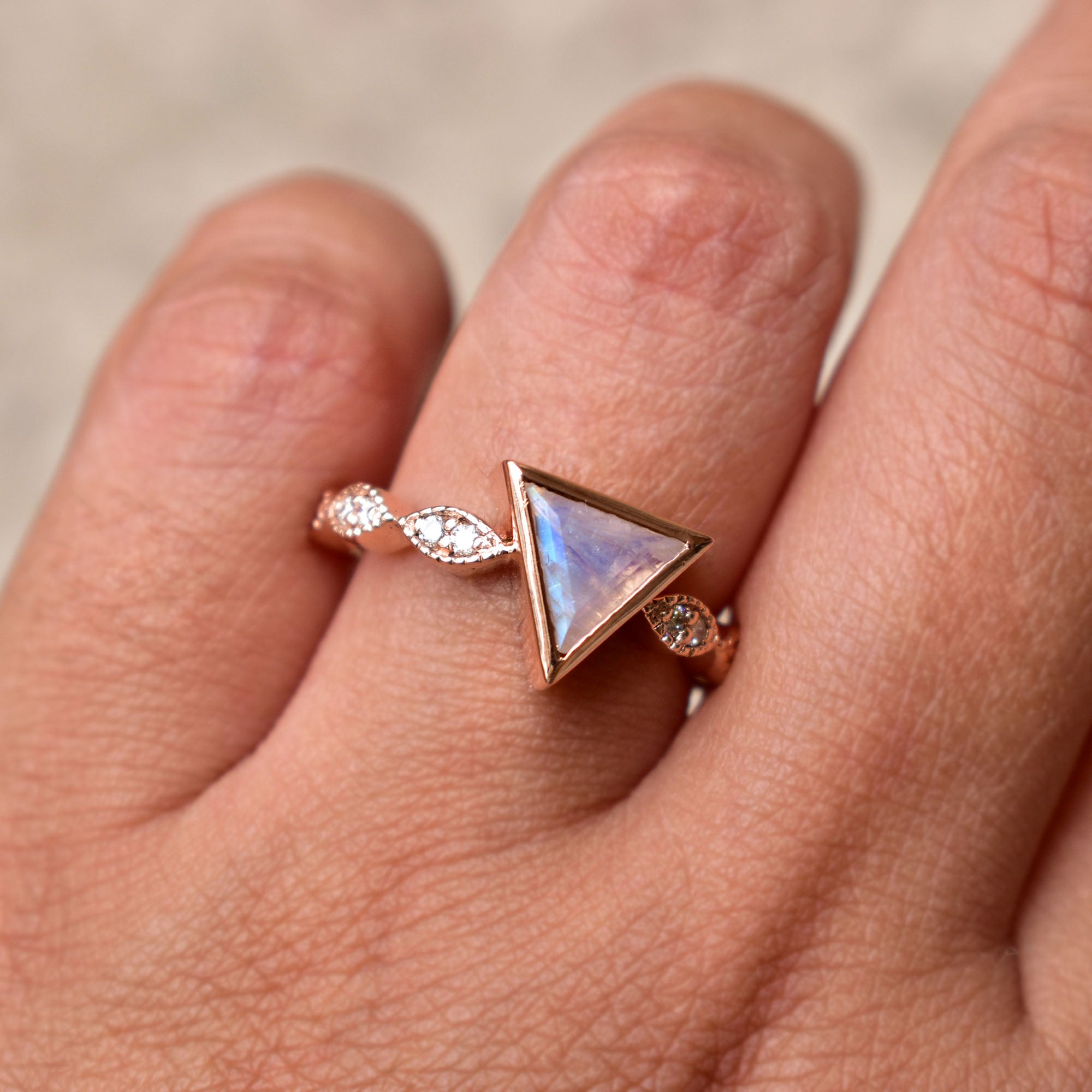 $969.00Truly magical triangle cut Rainbow Moonstone with blue sheen, set in a secure bezel setting in solid 14k rose gold with studded marquise leaf shank with milgrain, a stunning engagement...