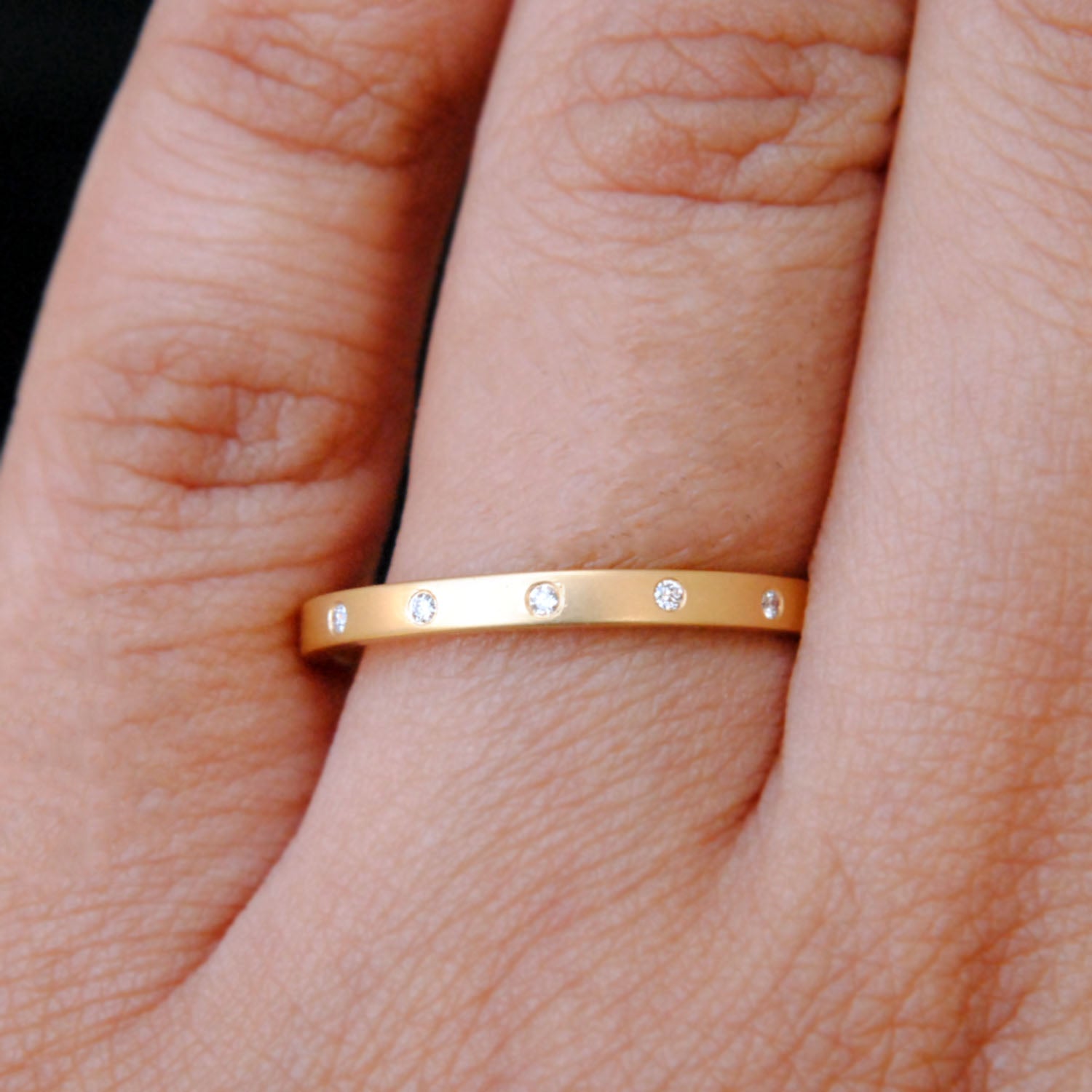 $635.00Simple and stylish, this 2mm broad band with 5 flush set diamonds, crafted in 14K Solid Gold is a perfect stack band which can be stunningly worn by itself. It...