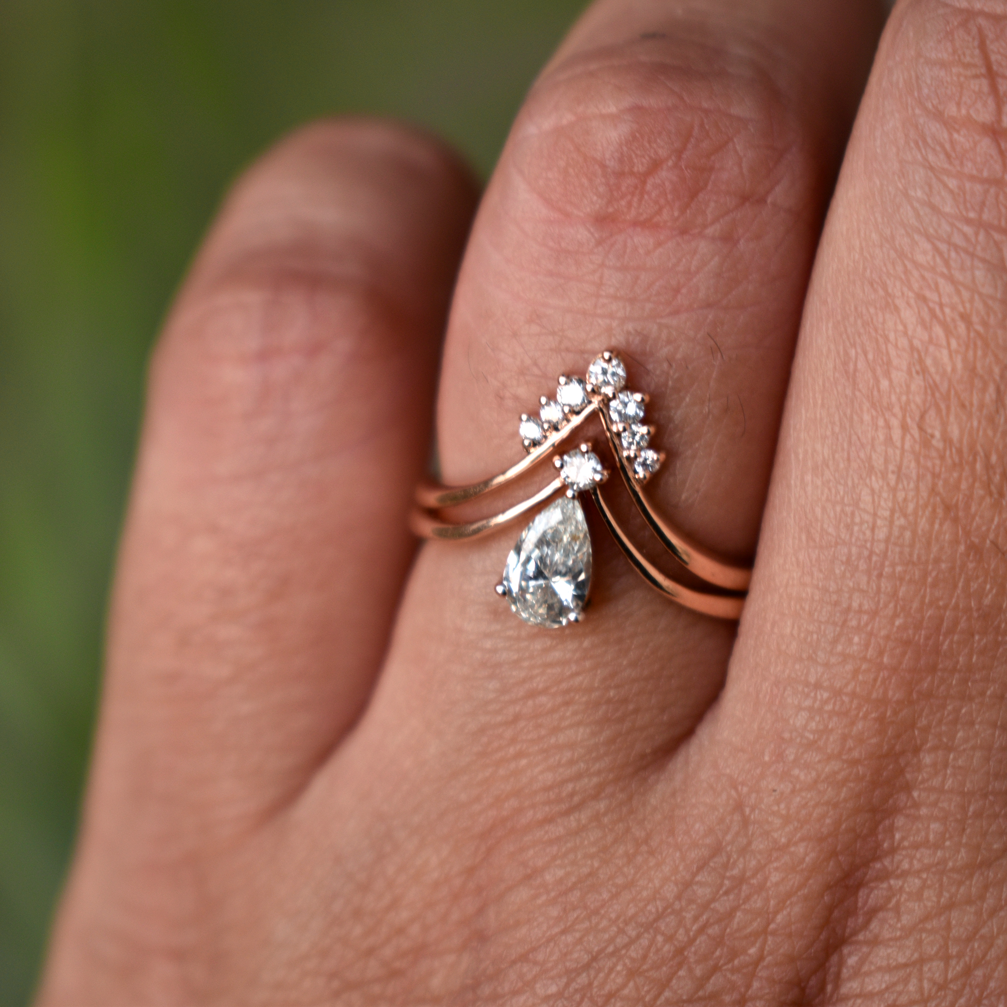 $2,050.00A beauty of a 0.30 Cts Pear Cut Diamond ring, handset in 14k solid rose gold, like a dandling diamond, stacked with a deep chevron V ring - this set...