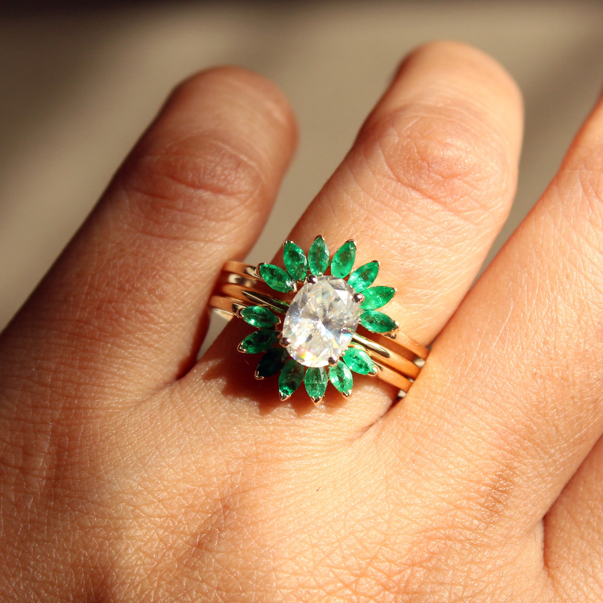 $1,953.00A royal 8x6mm Oval Moissanite, set in solid 14k gold, this classic solitaire ring along with our stunning natural green emerald ring wrap enhancer is all you need for your...