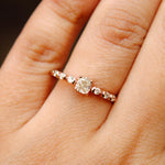 This dainty ring with 5 natural diamonds, flush set on the band, spaced apart. It makes a lovely minimal wedding stack band and can also be used as spacer ring....