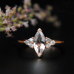Featuring a beautiful quarter carat gray rose cut diamond, pear shaped with celestial speckles, this ring is meticulously crafted in 14K Rose Gold. Black diamonds in channel setting forming a halo around the prong set pear diamond gives it a godly sparkle! A unique proposal or anniversary ring for you loved one.