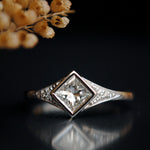 A subtle 0.57ct brown emerald cut Diamond, flanked by white princess cut and baguette cut diamonds on either side, this 5 diamond ring is crafted in 14k solid rose gold. A unique solitaire ring, for your exclusive story!