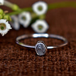 This dainty ring with 5 natural diamonds, flush set on the band, spaced apart. It makes a lovely minimal wedding stack band and can also be used as spacer ring....