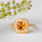 A beautiful Peachy Pink Oval Morganite, bezel set in rose gold, with a cluster of 3 princess cut diamonds on either side, this beauty is definitely a stunner.
