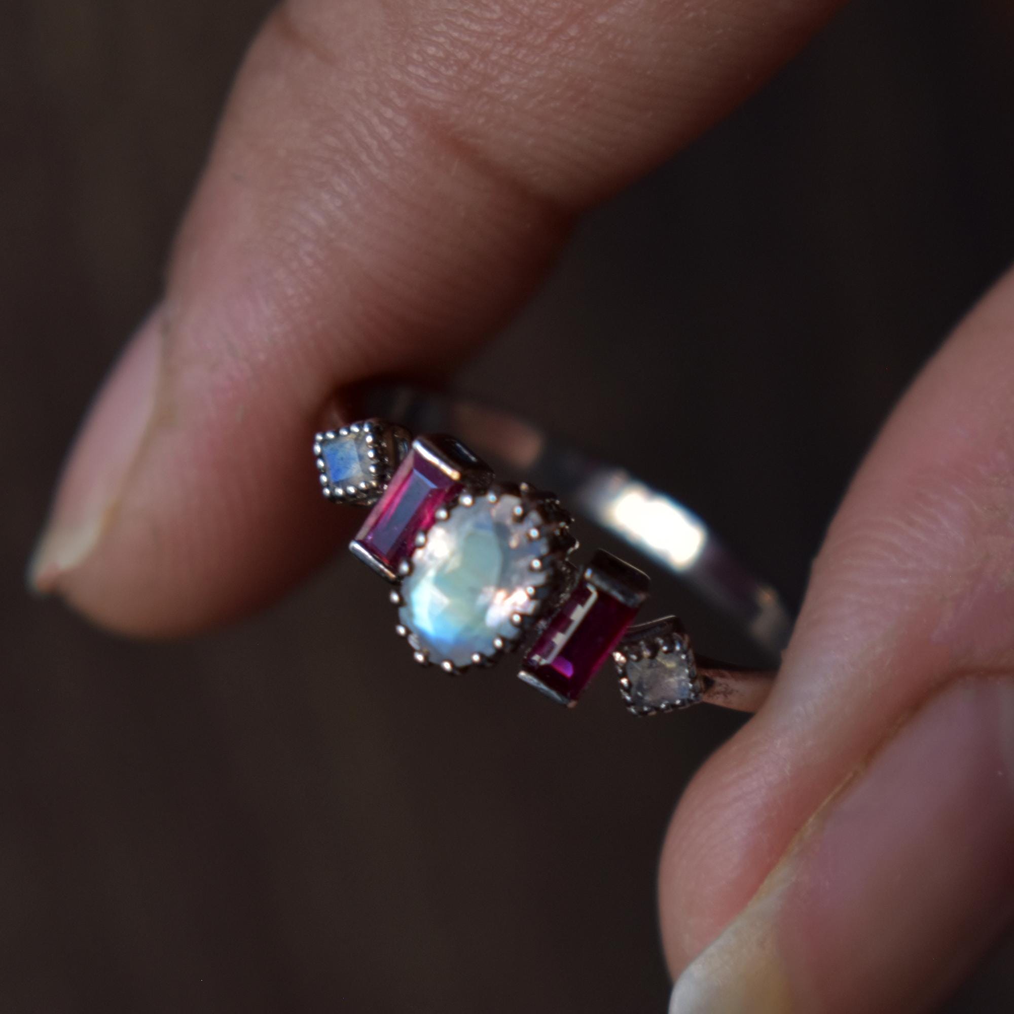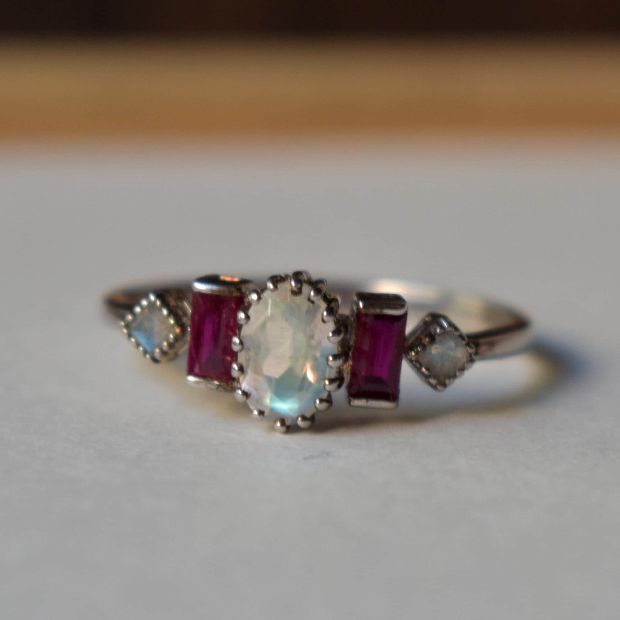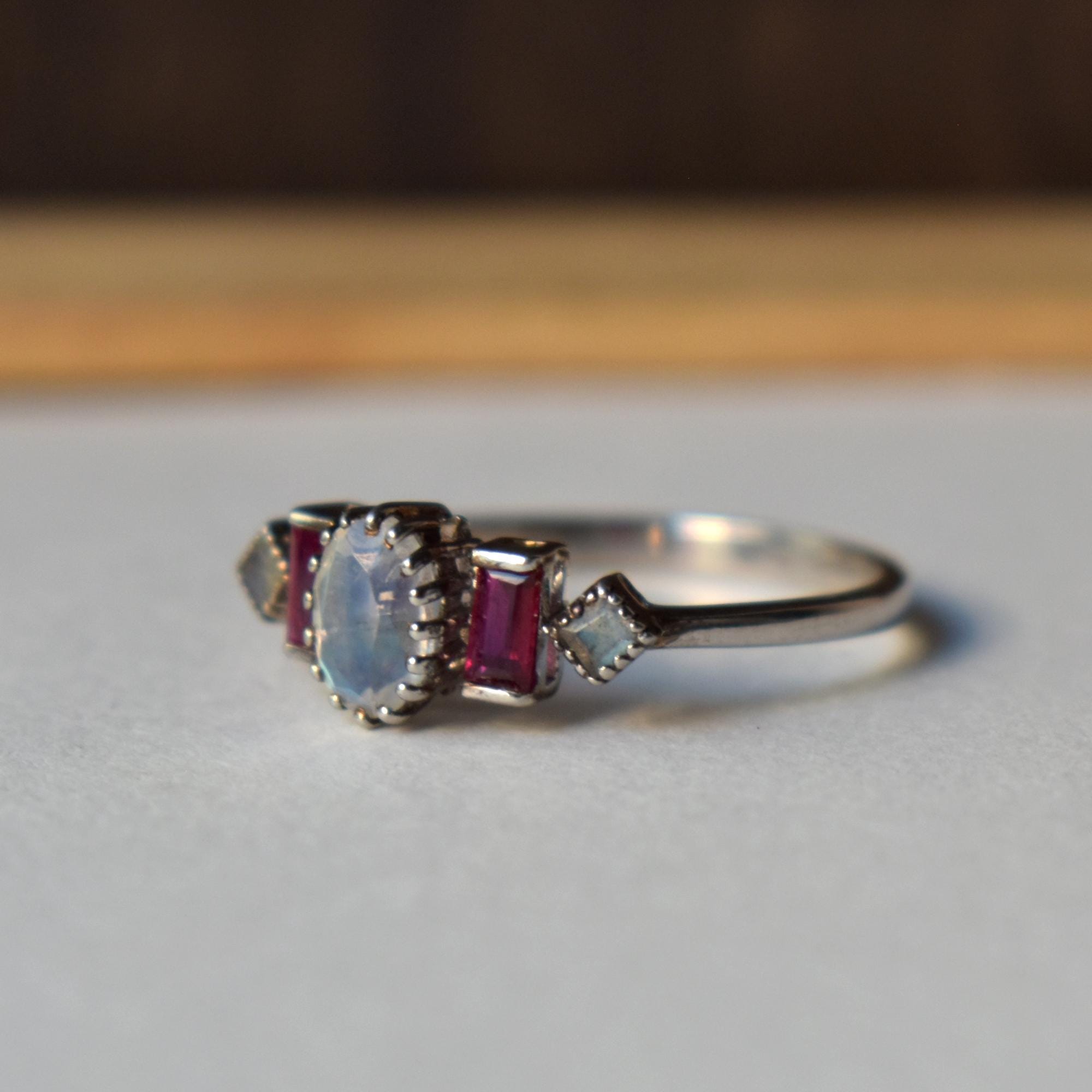 Natural Moonstone Ruby & Diamond Unique Geometric Ring