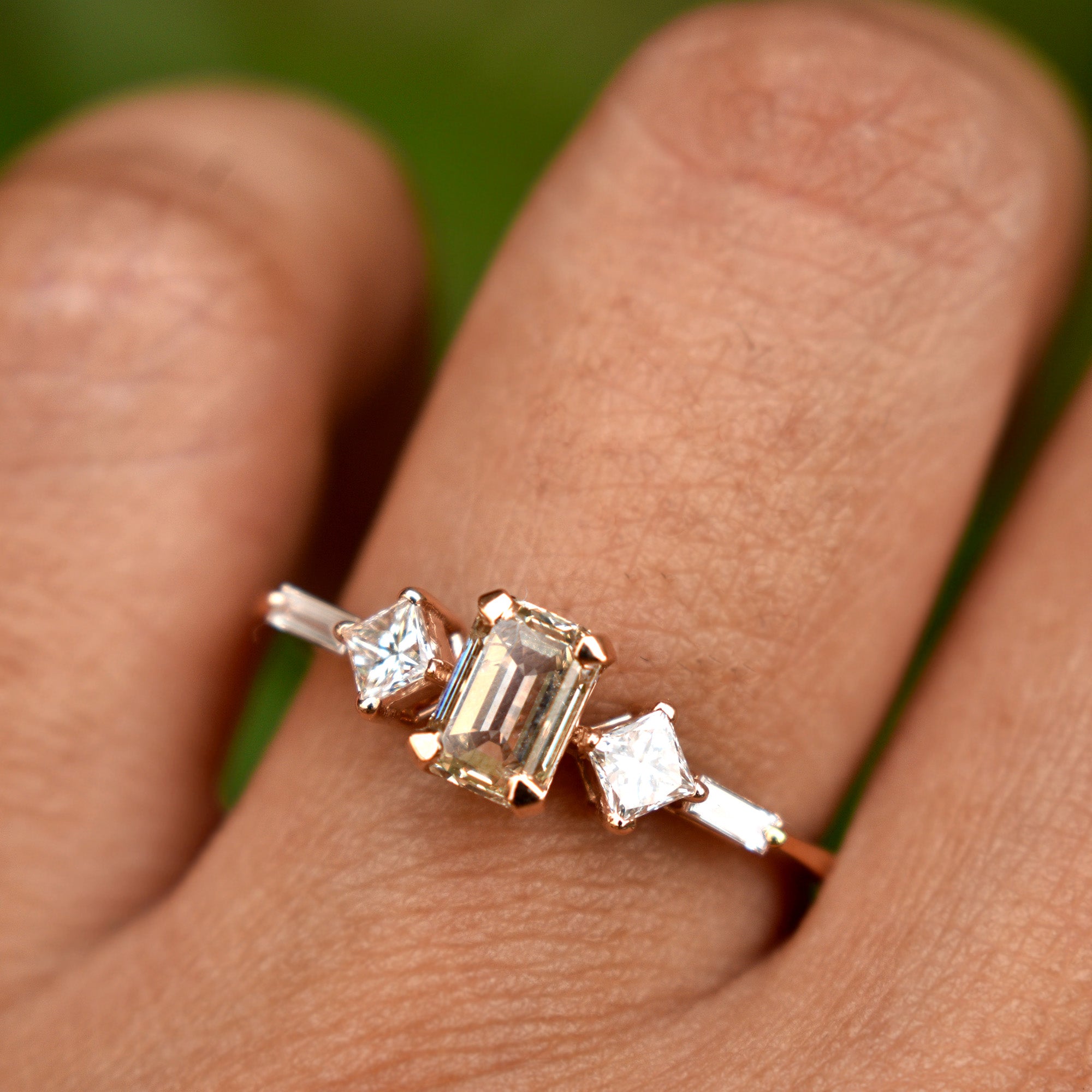 Three Stone Celestial Grey Rose Cut Diamond Engagement Ring